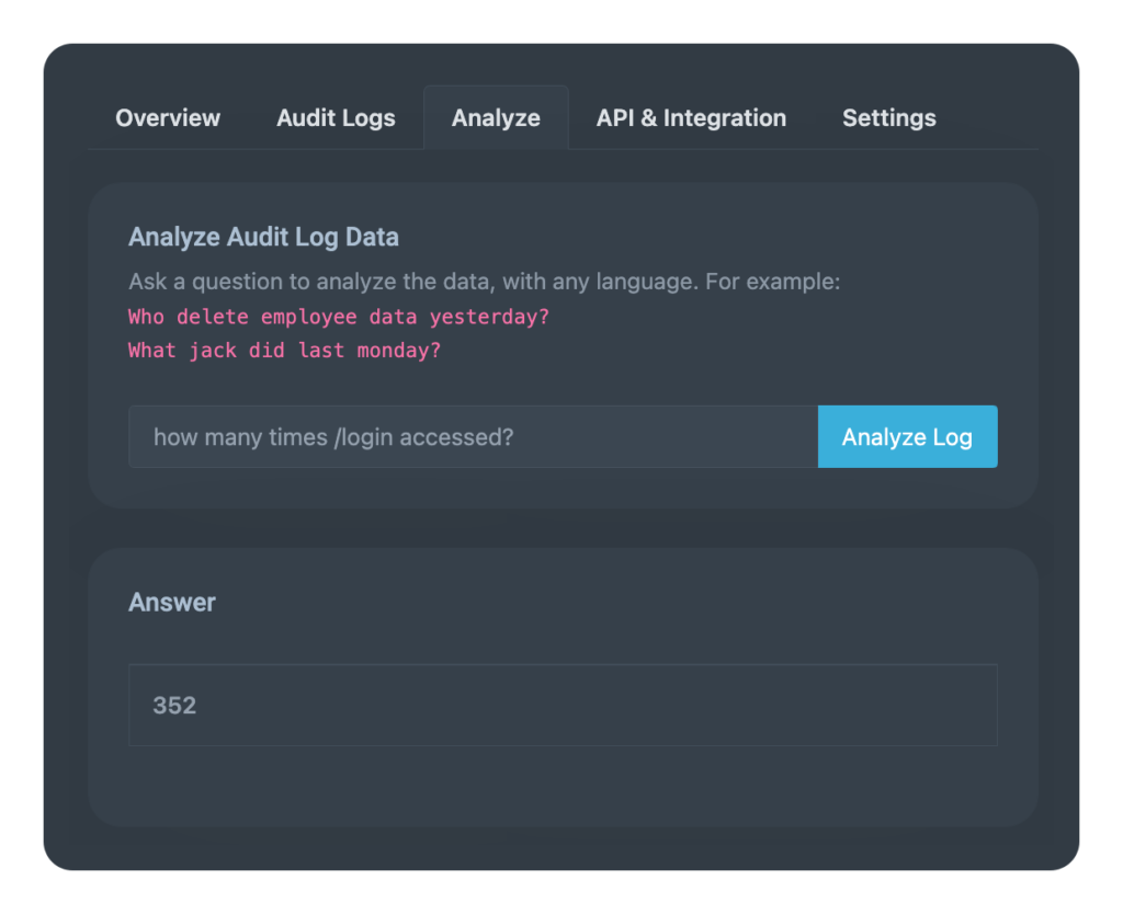 Simply ask LogZab “who delete employee data yesterday?” or “what John access every monday?”. Quick and easy to identify issues and potential problems for non-technical user.